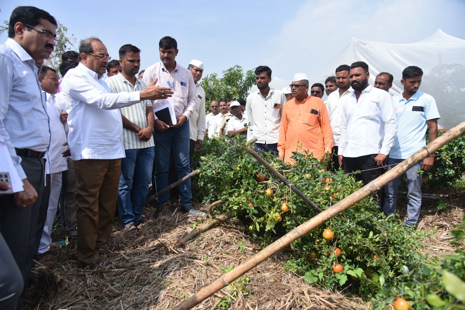 पाहणी दरम्यान पालकमंत्र्यांनी डाळिंब उत्पादकांशीही संवाद साधला अनेक भागांमध्ये डाळिंब उत्पादकांनी नवनवीन तंत्रज्ञान वापरले आहे. नवीन तंत्रज्ञानाच्या वापरामुळे शेतकऱ्यांना उत्पादनही मोठ्या प्रमाणात मिळत आहे. राहुल कसाब यांची फळभाग पूर्णपणे भुईसपाट झाली आहे, या बागेची पुन्हा बांधणी करण्यासाठी काय उपाययोजना करता येईल याविषयी डाळिंबरत्न डाॅ. बी.टी. गोरे यांच्याशी यासंदर्भात चर्चा करून शेतकऱ्यांना मार्गदर्शन करण्याच्या सूचना त्यांनी दिल्या. आंबा, कांदा उत्पादकांना देखील या वादळी पावसाचा मोठा फटका बसला आहे. कांदा चाळीवर पडलेल्या झाडांमुळे भिजलेल्या कांद्याचे पंचनामे करून अहवाल त्वरित पाठवण्याची सूचनाही श्री.विखे पाटील केल्या आहेत.