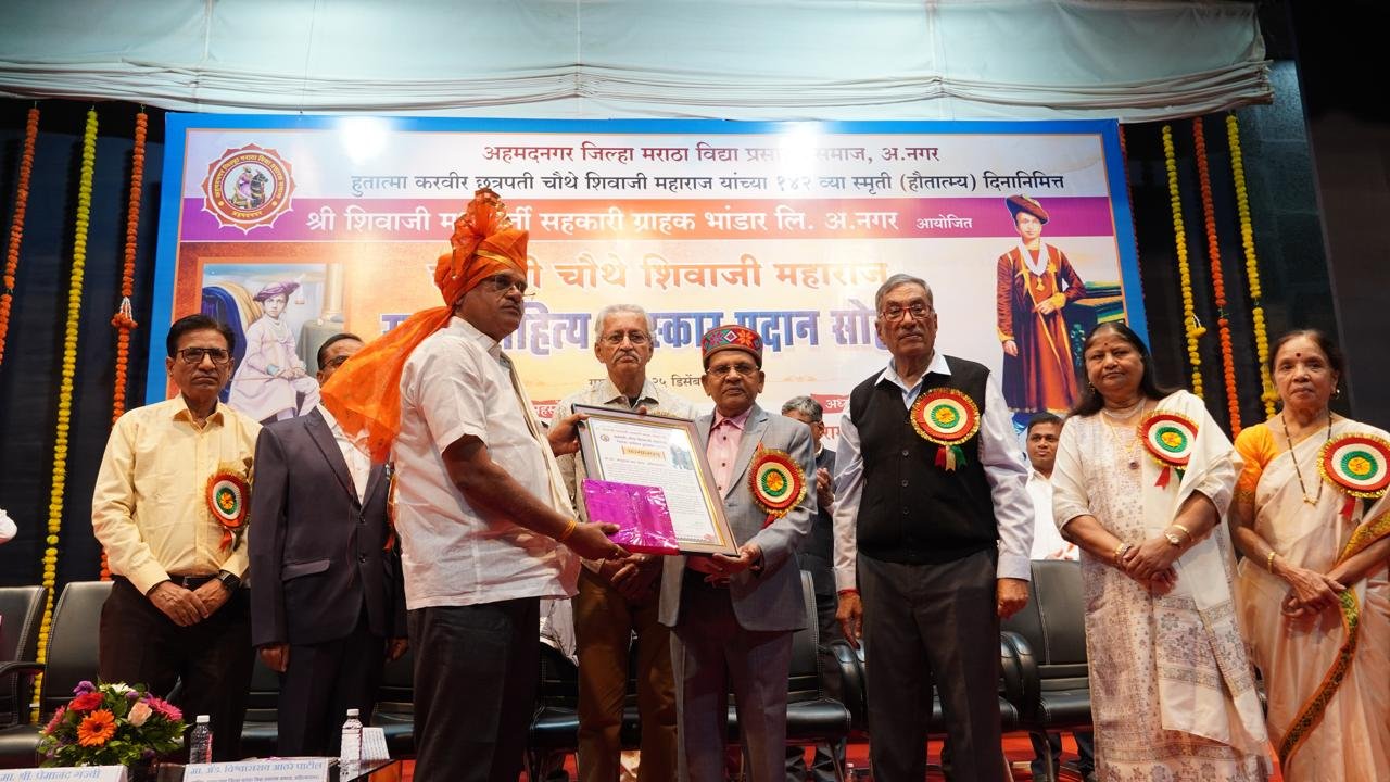 छत्रपती चौथे शिवाजी महाराज यांच्या 142 व्या हुतात्मा दिनानिमित्त जिल्हा मराठा विद्या प्रसारक समाज संस्थेच्या श्री शिवाजी मध्यवर्ती सहकारी ग्राहक भांडार च्या वतीने राज्यस्तरीय “छत्रपती चौथे शिवाजी महाराज राज्य साहित्य पुरस्कार प्रदान सोहळा” गुरुवार दिनांक 25 डिसेंबर 2025 रोजी सकाळी नऊ वाजता, राजर्षी शाहू महाराज सभागृह न्यू आर्ट्स कॉलेज अहिल्यानगर येथे आयोजित करण्यात आला होता. राज्यातील वेगवेगळ्या जिल्ह्यातील साहित्यिकांना एकूण आठ पुरस्कार देण्यात आले. त्यामध्ये प्रा भानुदास बेरड यांनी लिहिलेल्या “गंध मातीचा” या ललित लेख संग्रह ग्रंथास हा राज्यस्तरीय पुरस्कार देण्यात आला. सन्मान चिन्ह, मानपत्र, ग्रंथ, शाल व पुष्पगुच्छ, दहा हजार रुपये पुरस्कार राशी असे पुरस्काराचे स्वरूप होते. हा पुरस्कार श्री प्रेमानंद गजवी (अध्यक्ष, ९९वे अखिल भारतीय मराठी नाट्य संमेलन नागपूर) यांच्या हस्ते प्रदान करण्यात आला. यावेळी संस्थेचे उपाध्यक्ष डॉक्टर विवेक जी भापकर हे कार्यक्रमाचे अध्यक्ष होते. संस्थेचे विश्वासरावजी आठरे पाटील, मुकेश जी मुळे, ॲड दीपलक्ष्मी मसे, श्री दीपक दरे, न्यूयॉर्कचे प्राचार्य दीपक जी सागडे, निवड समितीचे निमंत्रक प्रा गणेश भगत, प्रा मेघा ताई काळे, न्यू लॉ कॉलेजचे प्राचार्य डॉक्टर एम एम तांबे, प्रा चंदनशिवे, प्रा मच्छिंद्र मालुंजकर, प्राचार्य रामदास टेकाळे, आदी मान्यवर उपस्थित होते.