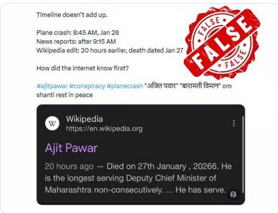 उपमुख्यमंत्री अजित पवार यांच्या विमानाचा अपघात होण्याच्या २१ तास आधीच विकिपीडियाने अजित पवार यांच्या पेजवर त्यांच्या मृत्यूची तारीख अपडेट केली होती. त्यामुळे, ही दुर्घटना घडवून आणल्याचा संशय निर्माण होतो, अशा आशयाचे सोशल मीडियावर व्हायरल झालेले दावे खोटे आहेत.