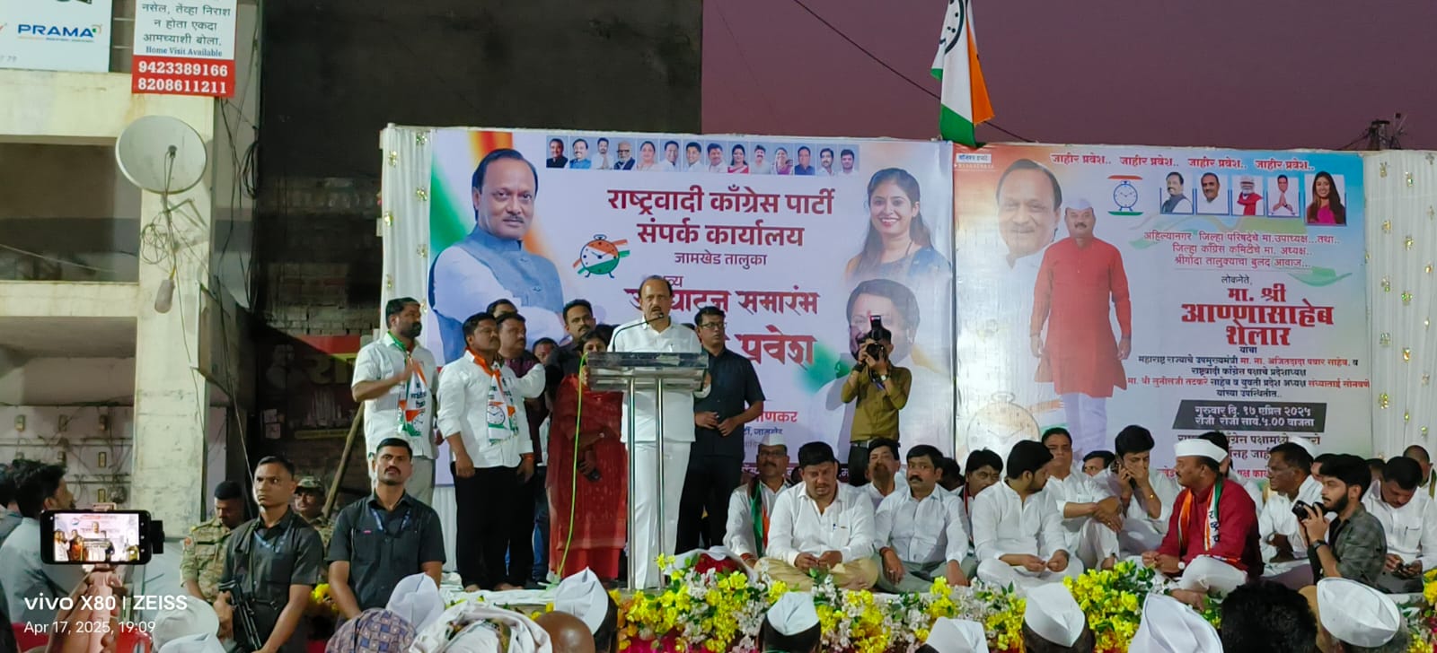 जामखेड येथील राष्ट्रवादी काँग्रेस संपर्क कार्यालय उद्घाटन व पक्षप्रवेश कार्यक्रम गुरुवार रात्री झाला यावेळी उपमुख्यमंत्री अजित पवार बोलत होते. यावेळी राष्ट्रीय युवक अध्यक्ष धिरज शर्मा, राष्ट्रवादी प्रवक्ते उमेश पाटील, राष्ट्रवादी जिल्हाध्यक्ष अशोक सावंत, राष्ट्रवादी काँग्रेसचे तालुकाध्यक्ष महेश निमोणकर, सचिन गायवळ, जिल्हा परिषदेचे माजी उपाध्यक्ष आण्णासाहेब शेलार, राजेंद्र गुंड, ॲड. बाळासाहेब मोरे, प्रदेश युवती अध्यक्ष संध्या सोनवणे आदी उपस्थित होते. यावेळी माजी जिल्हा परिषद उपाध्यक्ष आण्णासाहेब शेलार, बेलवंडी सरपंच ऋषीकेश शेलार व श्रीगोंदा येथील असंख्य कार्यकर्ते जामखेड येथील माजी नगरसेवक राजेश वाव्हळ, शामीर सय्यद, शिवसेना (उबाठा) शहराध्यक्ष गणेश काळे आदींनी उपमुख्यमंत्री अजित पवार यांच्या उपस्थितीत राष्ट्रवादी काँग्रेसमध्ये प्रवेश केला.