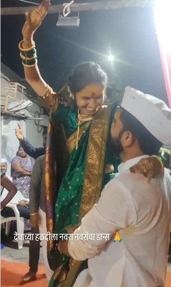 लग्नानंतर जागरण गोंधळाच्या कार्यक्रमात नवऱ्यानं नवरीला उचलून घेत डान्स केला आहे. लग्नानंतर जागरण गोंधळ हा महाराष्ट्रातील एक प्रमुख धार्मिक व सांस्कृतिक कुलाचार आहे, जो खंडोबा, भवानी माता किंवा कुलदेवतेच्या आशीर्वादाने वैवाहिक जीवन सुखी व्हावे आणि लग्नकार्य निर्विघ्न पार पडावे यासाठी केला जातो। यात कुलदेवतेची गाणी (गोंधळ), नृत्य आणि तळी भरून देवाला साकडे घातले जाते.यात ‘गोंधळी’ लोक पारंपारिक वेशभूषेत, दिवा (दिवट्या) हातात घेऊन देवीची/खंडोबाची गाणी गातात आणि तळी भंडार (भंडारा-खोबरे) अर्पण करतात.