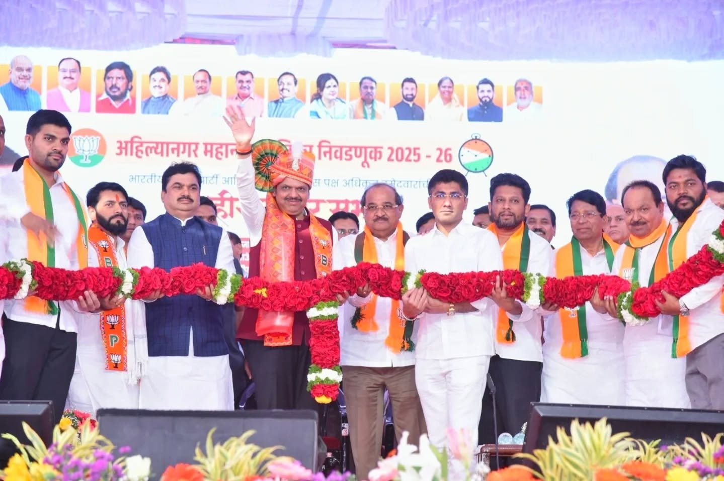 अहिल्यानगर महानगरपालिका सार्वत्रिक निवडणुकीच्या पार्श्वभूमीवर भाजपा-राष्ट्रवादी काँग्रेस युतीच्या अधिकृत उमेदवारांच्या प्रचारासाठी जाहीर सभा आयोजित करण्यात आली होती. याप्रसंगी मुख्यमंत्री बोलत होते.यावेळी व्यासपीठारावर विधान परिषदेचे सभापती प्रा. राम शिंदे, अहिल्यानगर जिल्ह्याचे पालकमंत्री राधाकृष्ण विखे पाटील, माजी मंत्री बबनराव पाचपुते, माजी खासदार सुजय विखे पाटील, आमदार संग्राम जगताप, आमदार विक्रम पाचपुते, आमदार मोनिकाताई राजळे, जिल्हाध्यक्ष दिलीप भालसिंग, उत्तर जिल्हा अध्यक्ष नितीन दिनकर, युवा नेते अक्षय कडले, शहरजिल्हाध्यक्ष अनिल मोहिते, अशोक सावंत, संपत बारस्कर, विनायकराव देशमुख, अशोक गायकवाड, नगराध्यक्ष सत्यजित कदम, अभय आगरकर, महेश नामदे आदींसह अनेक मान्यवर उपस्थित होते.