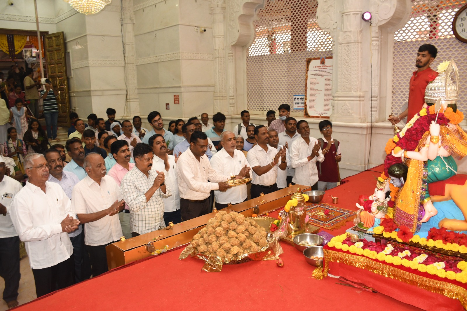 यावेळी यावेळी प्रा. राम शिंदे मित्र मंडळाच्या वतीने कार्यालय प्रमुख सोमनाथ बाचकर, दत्तात्रय कोपनर, समीर कुलकर्णी, देवस्थानचे अध्यक्ष अॅड. अभय आगरकर व निशांत दातीर यांच्या हस्ते महाआरती पार पडली. यावेळी चंद्रकांत फुलारी, नितीन पुंड उपस्थित होते. महाआरतीनंतर भाविकांना तिरुपती लाडू प्रसादाचे वाटप करण्यात आले. मंदिराचा परिसर भक्तांच्या ‘गणपती बाप्पा मोरया’ या जयघोषाने दुमदुमून गेला.े