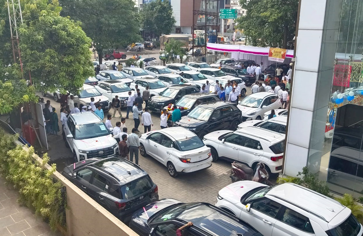 नगर-पुणे महामार्गावरील इलाक्षी ह्युंदाई शोरुममध्ये वाहन खरेदीसाठी गर्दी 75 ह्युंदाई कार्सचे वितरण