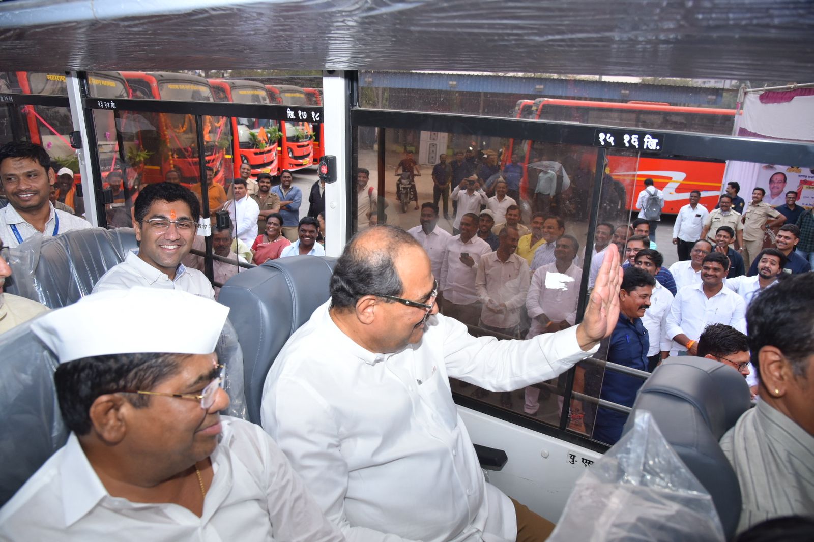 जिल्ह्यातील विविध आगारासाठी प्राप्त झालेल्या नवीन ४५ एसटी बसेसचे लोकार्पण व अहिल्यानगर-पुणे विनावाहक बस सेवेचा शुभारंभ जलसंपदा मंत्री तथा जिल्ह्याचे पालकमंत्री राधाकृष्ण विखे पाटील यांच्या हस्ते तारकपूर बस स्थानक येथे करण्यात आला.