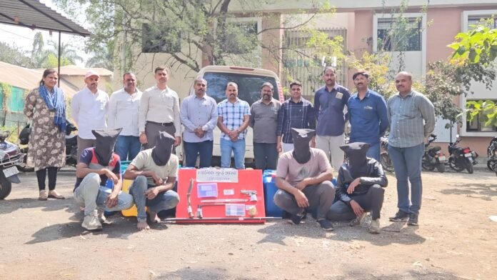 पोलीस अधीक्षक सोमनाथ घार्गे यांनी जिल्ह्यातील दरोडा, घरफोडी व रोड रॉबरी गुन्ह्यांना आळा घालण्यासाठी नियमित गस्त व विशेष कारवायांचे आदेश स्थानिक गुन्हे शाखेला दिले होते. त्यानुसार पोलीस निरीक्षक किरणकुमार कबाडी यांच्या मार्गदर्शनाखाली सहायक पोलीस निरीक्षक हरीष भोये, उपनिरीक्षक संदीप मुरकुटे, अंमलदार सुनील पवार, गणेश धोत्रे, शाहिद शेख, सुरेश माळी, आकाश काळे, भगवान धुळे, अर्जुन बडे, अरविंद भिंगारदिवे, शिवाजी कावडे यांच्या पथक गस्त घालत असताना शनिवारी (21 फेब्रुवारी) निरीक्षक कबाडी यांना बातमीदारामार्फत माहिती मिळाली की, मध्यप्रदेश राज्यातील एक टोळी विनानंबरच्या पांढर्या रंगाच्या स्कॉर्पिओ वाहनातून आगडगावकडून बुर्हानगरकडे येत असून शहरात दरोडा टाकण्याच्या तयारीत आहे.मिळालेल्या माहितीच्या आधारे पथकाने बुर्हानगर-आगडगाव रस्त्यावर सापळा रचला. दरम्यान, संशयित स्कॉर्पिओ दिसताच पोलिसांनी वाहन अडविले. त्याचवेळी सहा इसमांनी पळ काढला. पोलिसांनी पाठलाग करून चार जणांना ताब्यात घेतले, तर दोघे पसार झाले. सादिकखान इसाकखान (वय 37), देवसिंग बाबुलाल भिलालाल (वय 24, दोघे, रा. मध्यप्रदेश), दानिश सादिक शेख (वय 24), दानिश अजीज शेख (वय 24, दोघे रा. कापुरवाडी, ता. अहिल्यानगर) अशी ताब्यात घेतल्यांची नावे आहेत. तर, राजाराम फुलेरिया व राजेश परमार (दोघे रा. मध्यप्रदेश) पसार झाले आहेत.