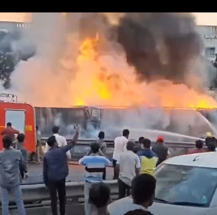 मिळालेल्या माहितीनुसार कंटेनर, कार आणि आणखी एक कंटेनरअशी तिन्ही वाहनं एकाच दिशेने भरधाव वेगाने जात होती. पुढील कंटेनरनचालकाने अचानक ब्रेक लावला. मागून येणाऱ्या कारचालकाला वाहन नियंत्रणात आणता न आल्यानं ती कार पुढील कंटेनरवर धडकली. त्यानंतर मागील कंटेनरही मधल्या कारवर आदळला. या धडकेनंतर काही क्षणातच दोन्ही कंटेनरना आग लागली.
