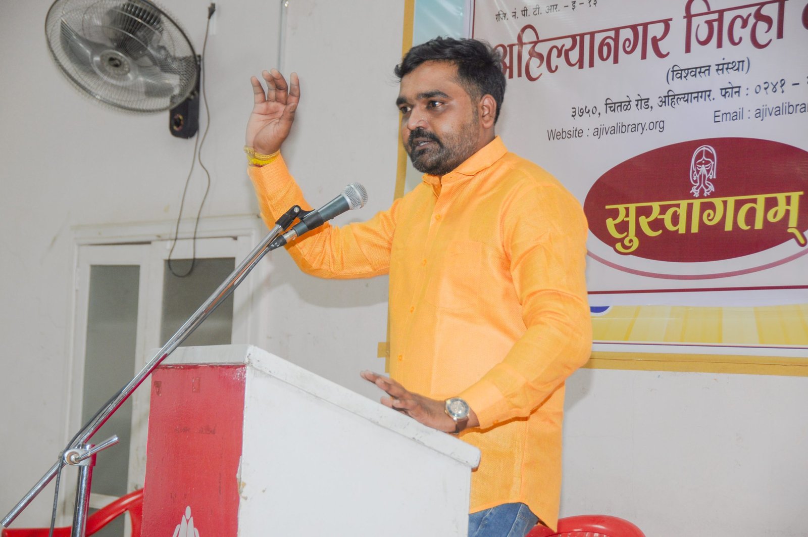 अहिल्यानगर जिल्हा वाचनालयात आयोजित वसंत व्याख्यानमालेचे दुसरे पुष्प “अंत: अस्ति प्रारंभ: या विषयावर गुंफताना ते तरुणाईशी संवाद साधत होते. त्याप्रसंगी मराठी साहित्य परिषदेचे अध्यक्ष किशोर मरकड, वाचनालयाचे अध्यक्ष शिरीष मोडक, उपाध्यक्ष दिलीप पांढरे संचालिका शिल्पा रसाळ, ज्योती कुलकर्णी ,संचालक राहुल तांबोळी, किरण आगरवाल ,कवी चंद्रकांत पालवे, ग्रंथपाल अमोल इथापे, नितीन भारताल ,कुमारी पल्लवी कुक्कडवाल उपस्थित होते.