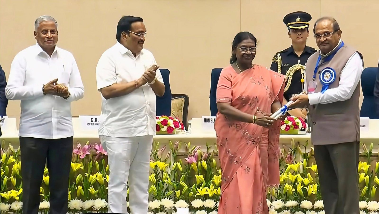 नवी दिल्ली येथील विज्ञान भवनात आज झालेल्या सोहळ्यात राष्ट्रपतींच्या हस्ते राष्ट्रीय जल पुरस्कार – 2024 प्रदान करण्यात आले. केंद्रीय जलशक्ती मंत्री सी. आर. पाटील, जलशक्ती राज्यमंत्री राजभूषण चौधरी, राज्यमंत्री व्ही. सोमन्ना, विभागीय सचिव व्ही. एल. कांथाराव व विभागाचे सचिव अशोक, के. के. मीना यावेळी उपस्थित होते. श्री. विखे पाटील यांच्यासोबत राज्याच्या जलसंपदा विभागाचे अतिरिक्त मुख्य सचिव दिपक कपूर उपस्थित होते.